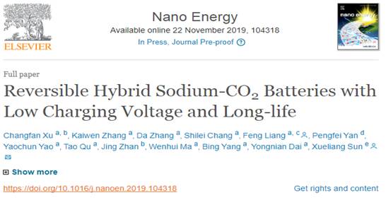 近日,PG赏金女王 本科生徐昌藩同学在梁风教授指导下,在国际能源领域知名期刊《Nano Energy》(影响因子:15.5)上发表题为“Reversible Hybrid Sodium-CO2 Batteries with Low Charging Voltag...