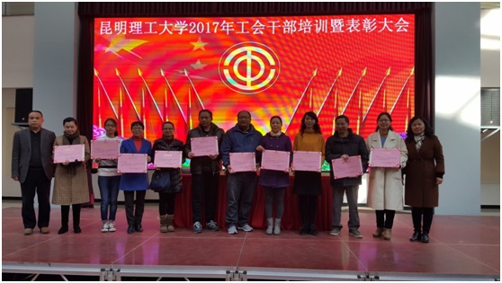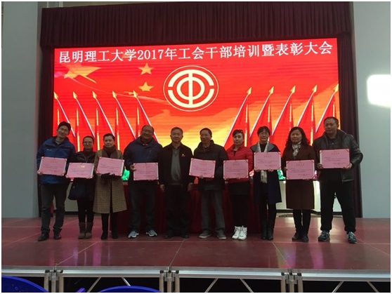 2017年12月26日下午校工会在工会教职工之家校工会召开了2017年工会干部培训暨表彰大会。首先请党校领导进行了十九大精神宣讲。并请云南省总工会财务部黄越红部长作工会财务管理专题培训。最后是表彰大会:1.表彰获云南省师德标兵称号个人。2. 表彰云南省教育卫生科研工会论文获奖人员。3. 表彰2017年校级师德先进个人。4. 表彰2011-2016年工会工作先进个人及集体。5. 向获得第五批校级“模范职工小家”的基层工会授牌。