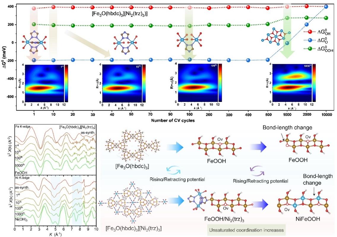 针对这一领域难题,提出了MOF重构的时空异步调控策略,通过轨道耦合的孔道微环境驱动空间分离的铁/镍金属节点发生分阶段动力学重构。团队集成了原位X射线吸收光谱(In-situ XAS)、原位拉曼光谱与实时反应动力学追踪的多模态原位表征平台,揭示了重构过程的调控机制及跨尺度动力学规律。首次在原子-介观尺度上清晰揭示了MOF从铁基活性相到镍铁基高活性相的重构动力学实时监测,功能分区的孔道结构强化了铁-镍节点间的协同作用,而自适应缺陷、键弛豫及结构再生效应共同调控了催化动力学行为,最终实现了析氧反应活性的显著提升。这种动态追踪方法将MOF重构的时空调控与多尺度动态追踪相结合的创新方法,不仅深化了对析氧反应(OER)催化剂动态行为的基础认知,还为MOF催化剂的设计提供了全新范式。