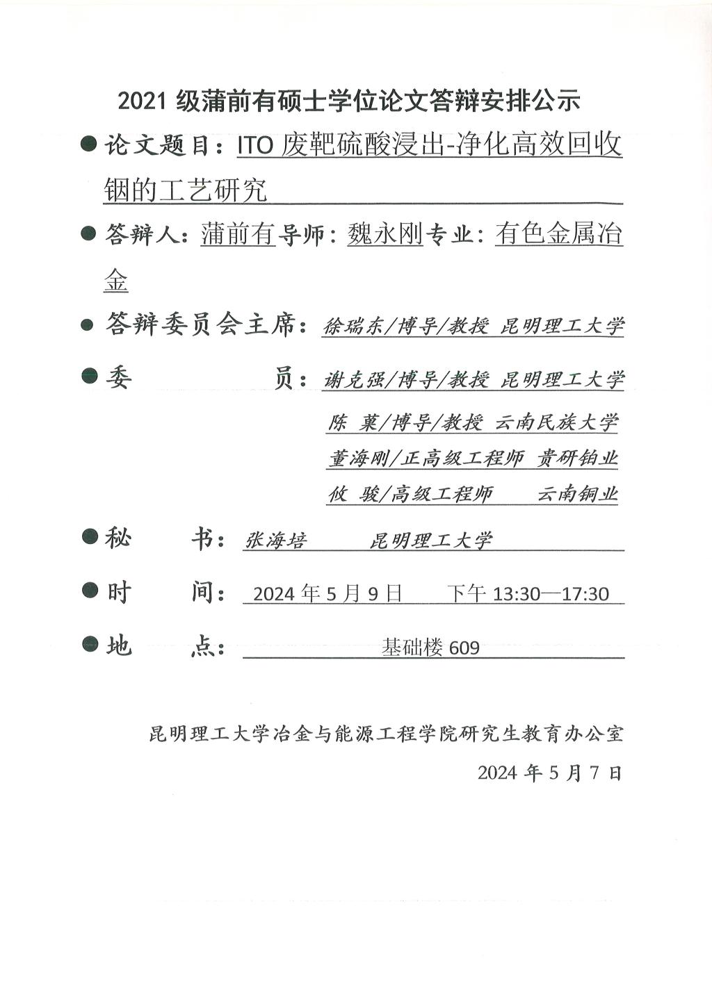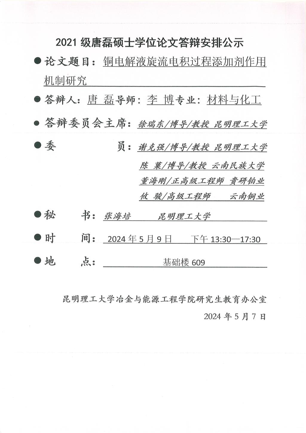 2024年硕士论文答辩公示——蒲前有,冉雨璇,王卓,屈文开,王光彪,唐磊2024.5.9