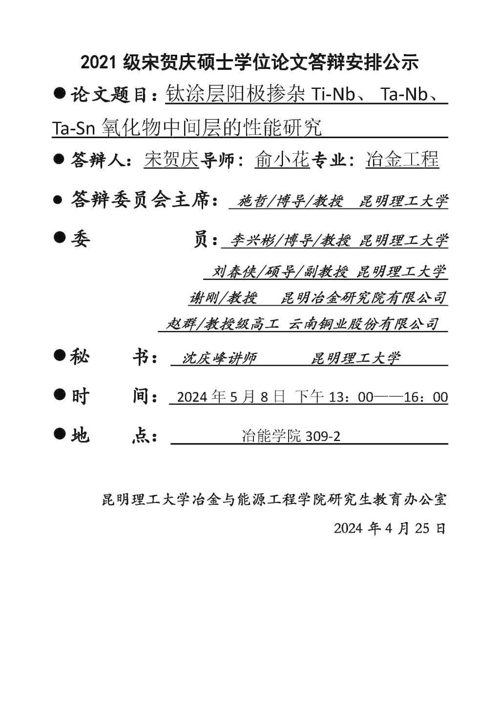 2024年硕士论文答辩公示——崔武江,谭紫东,张程2024.5.6