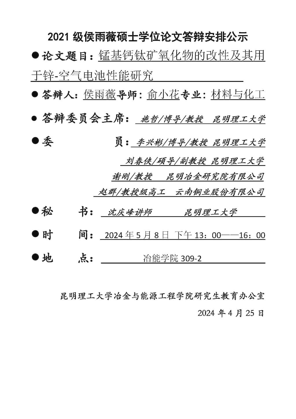 2024年硕士论文答辩公示——侯雨薇,宋贺庆,朱一鸣2024.5.8