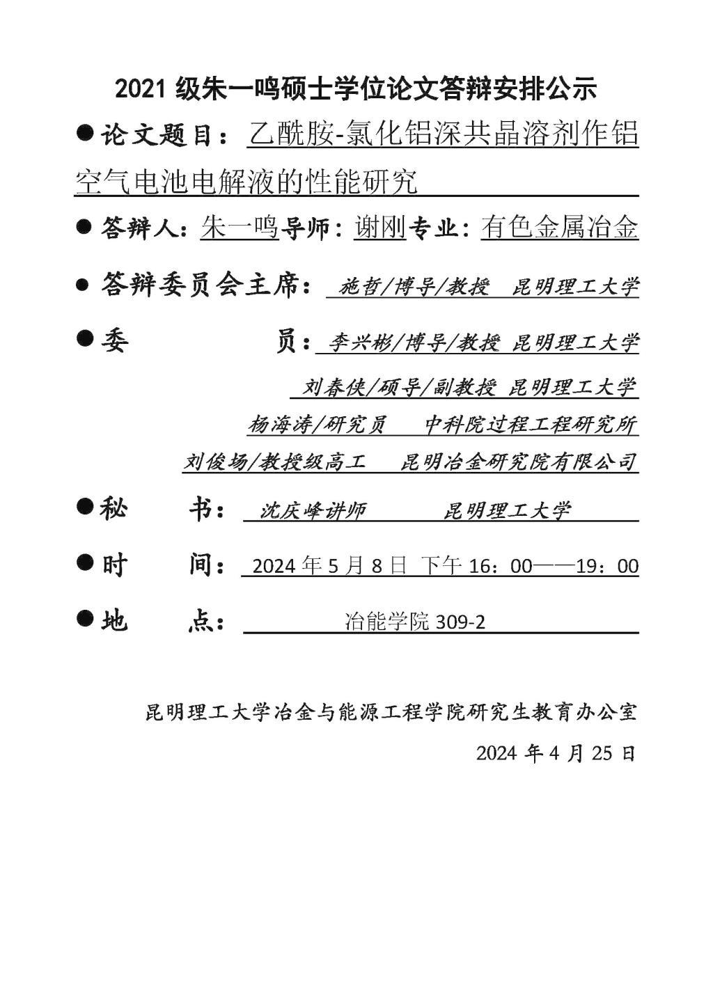 2024.4.29硕士研究生第一批公开答辩安排