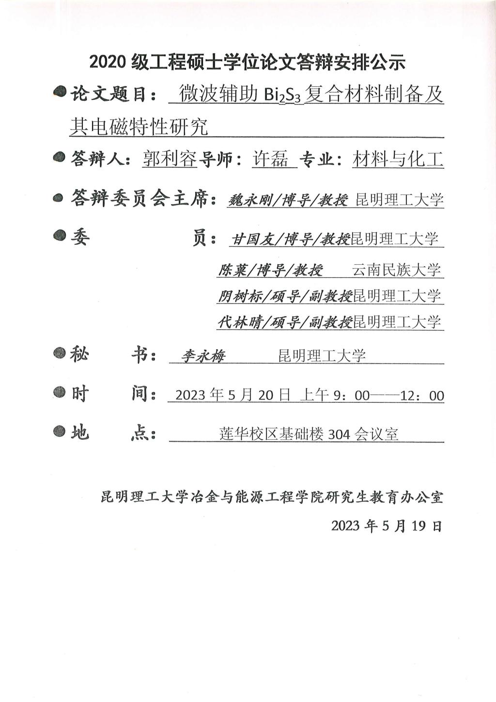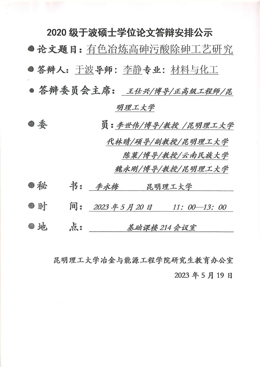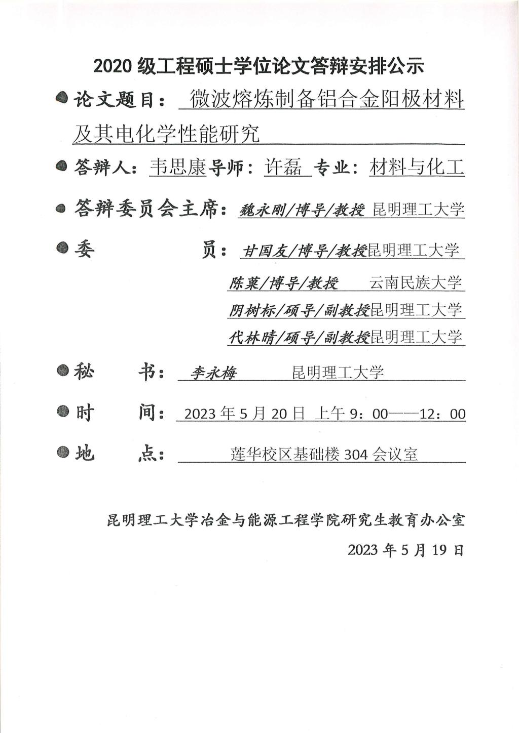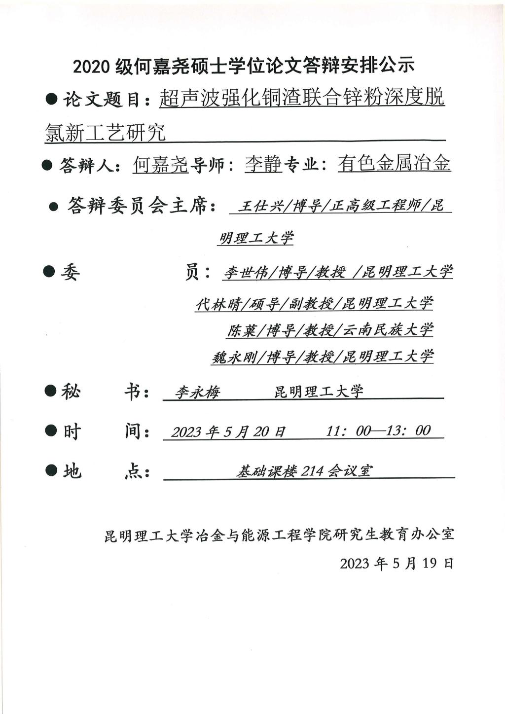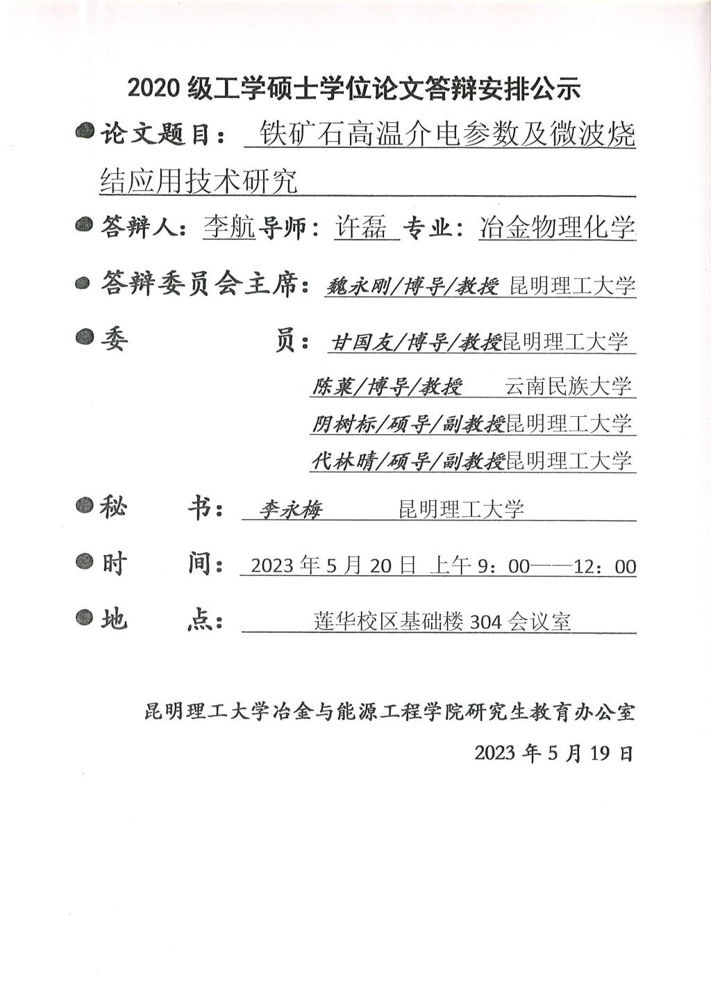 硕士学位论文答辩公示——何嘉尧,于波,李航,郭利容,韦思康,许张彪——2023.5.20