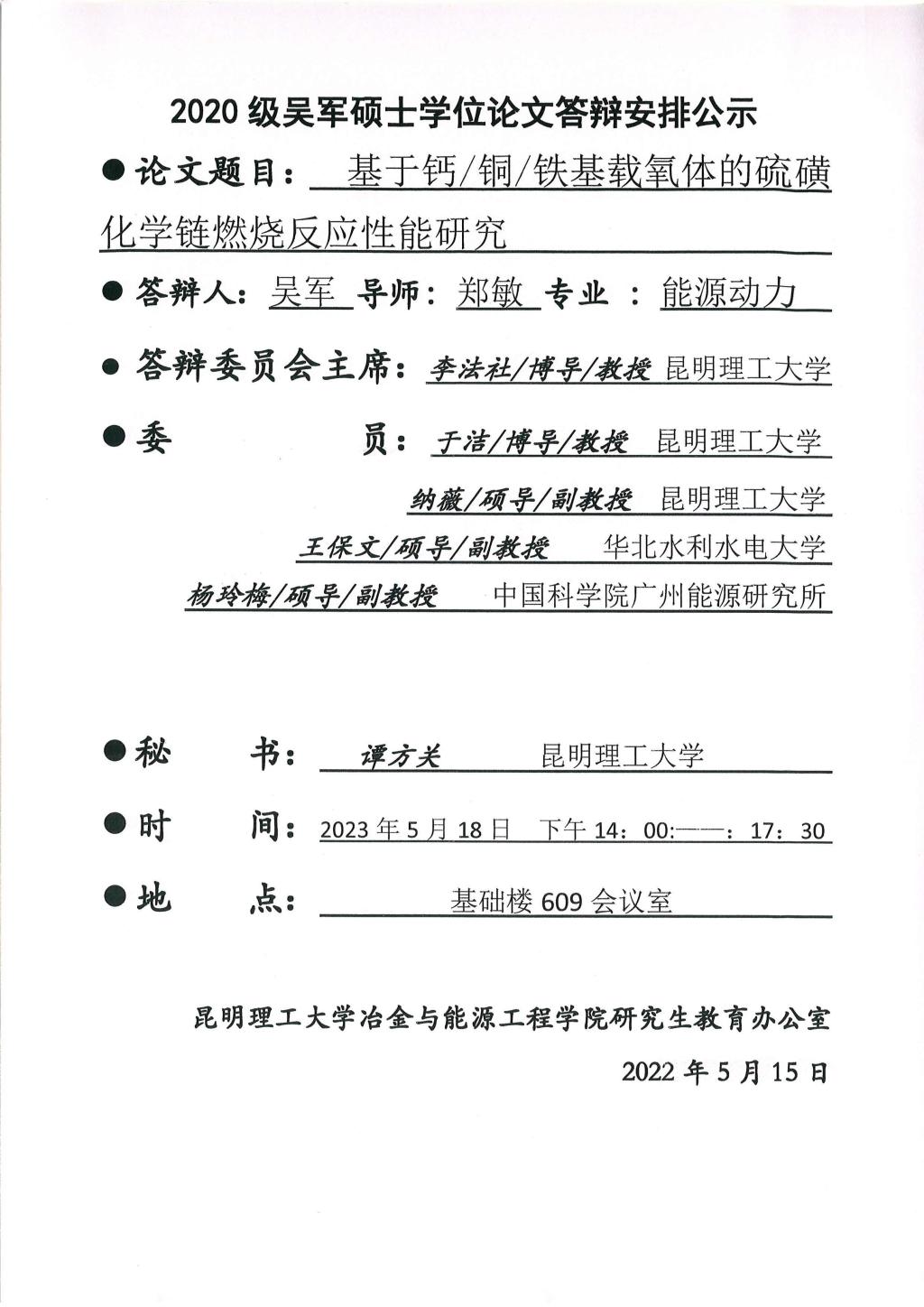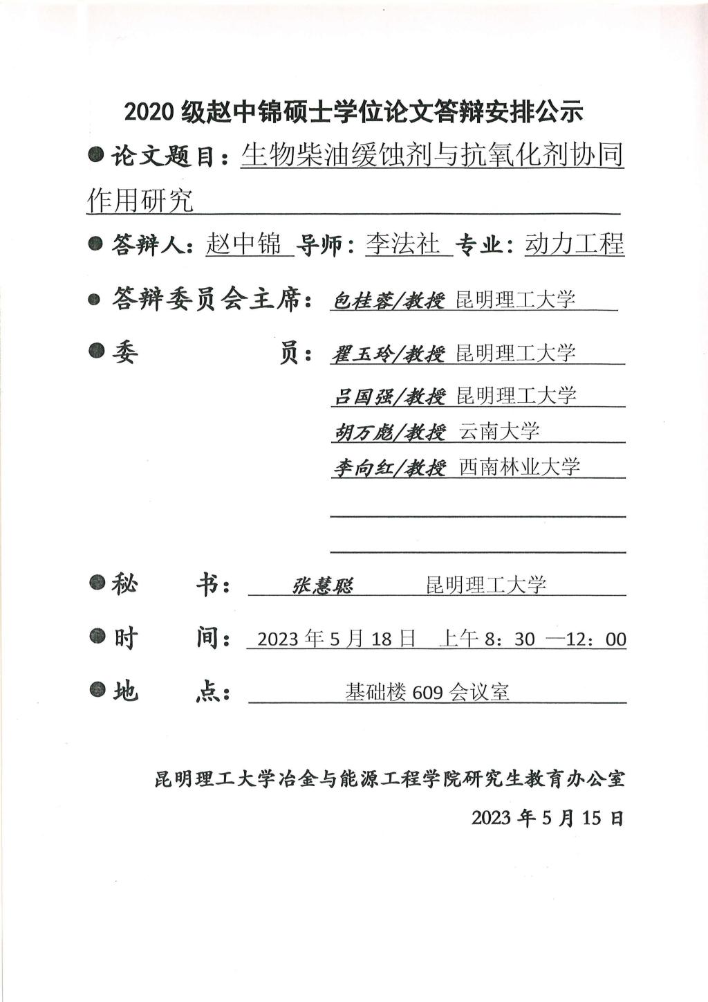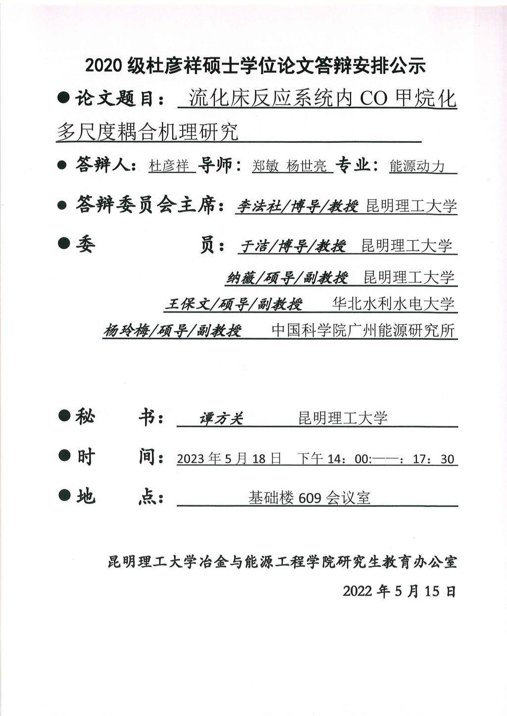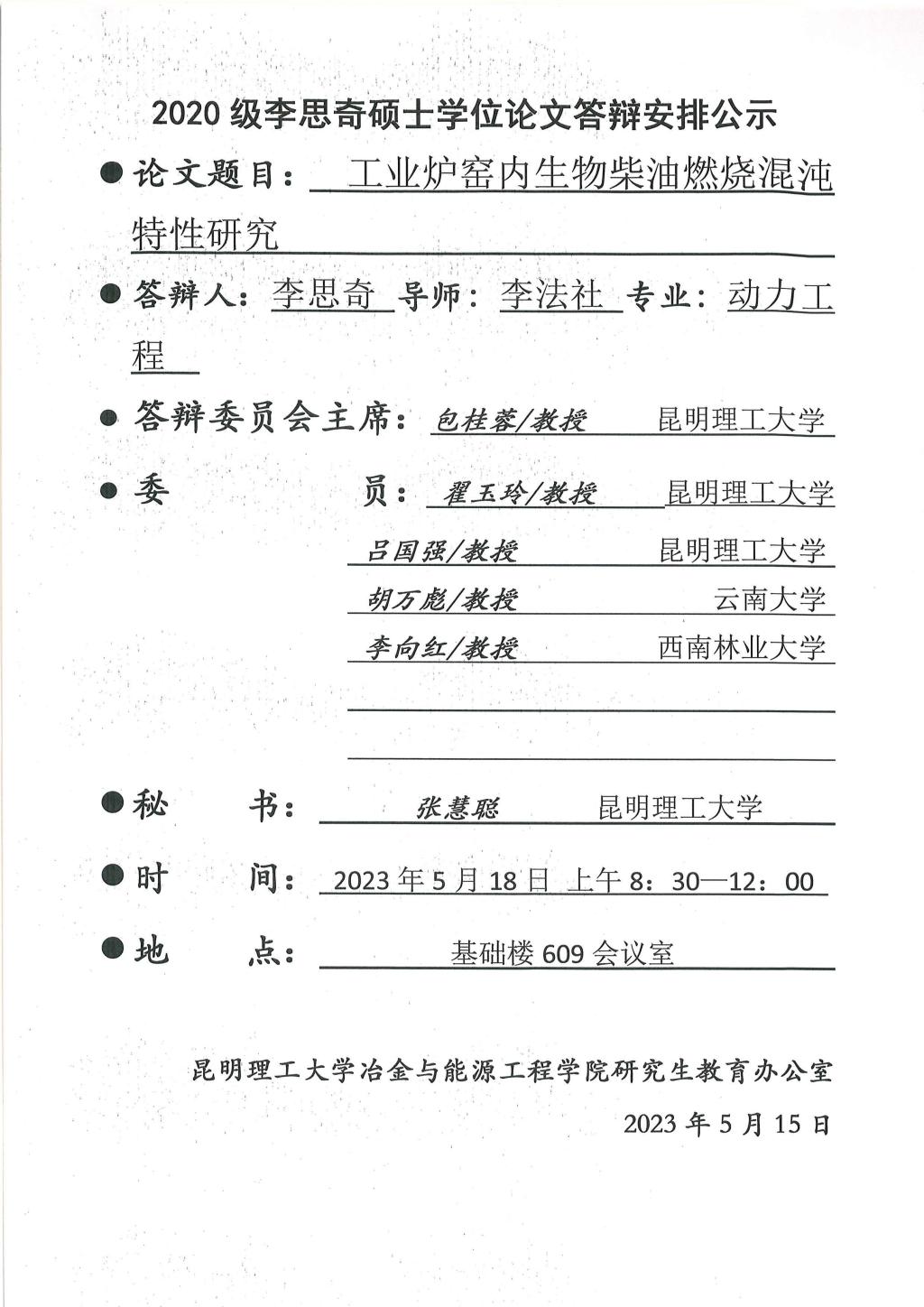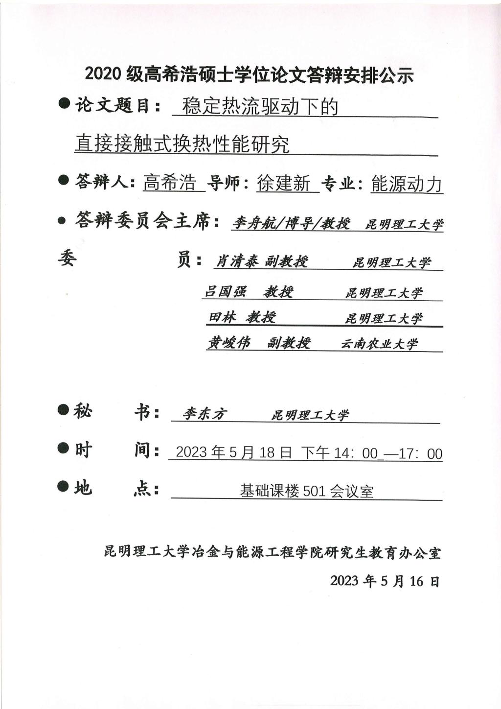 硕士学位论文答辩公示——高希浩,李思奇,赵中锦,吴军,张凯歌,杜彦祥——2023.05.18