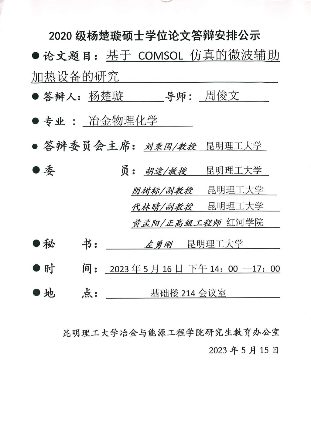 硕士学位论文答辩公示——邹全,钟文锐,沈天昊,匡彪——2023.5.17