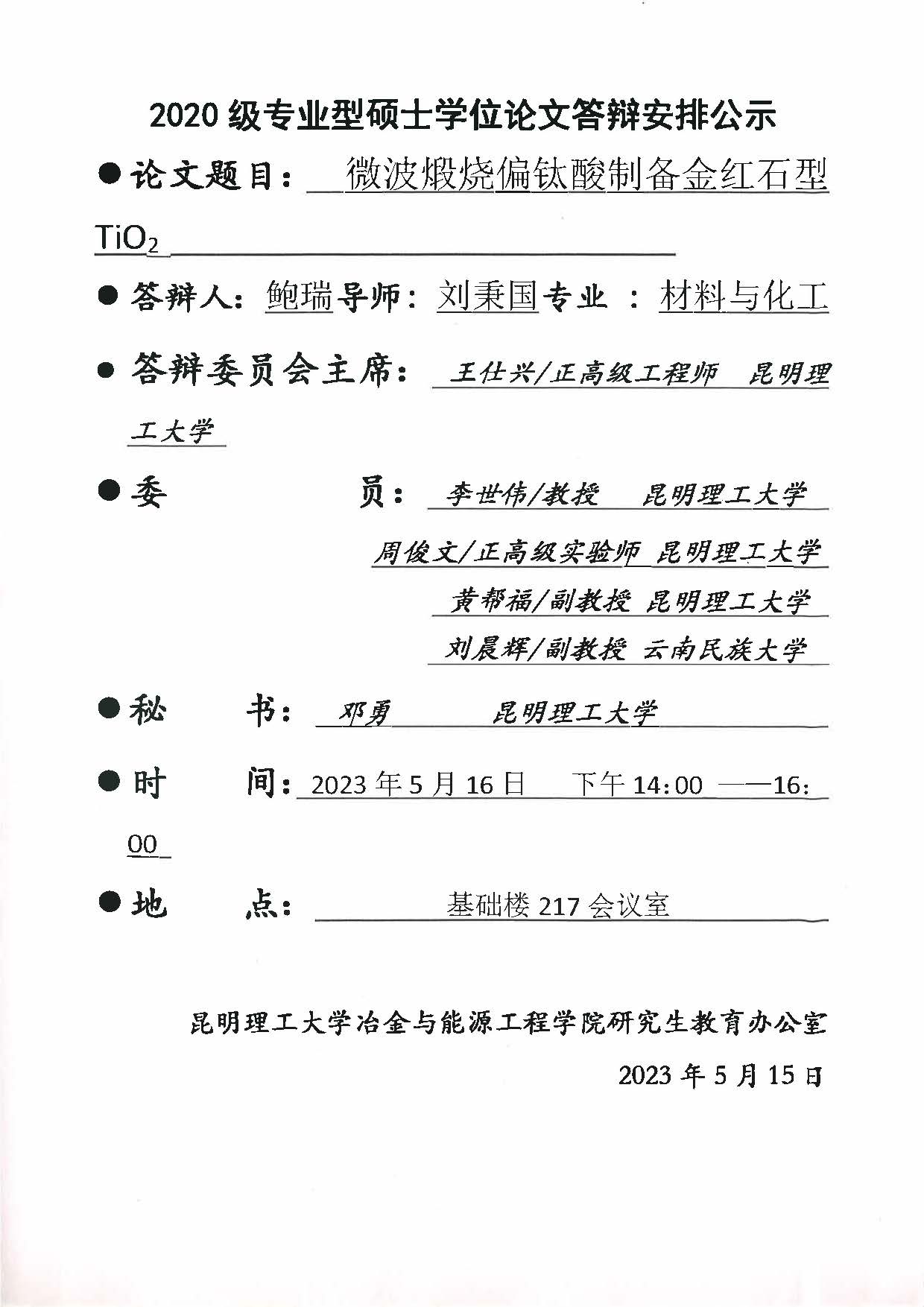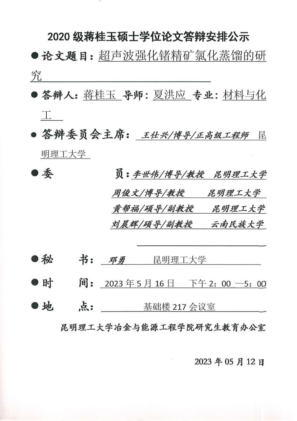 硕士学位论文答辩公示——鲍瑞,吴邦建,蒋桂玉——2023.05.16