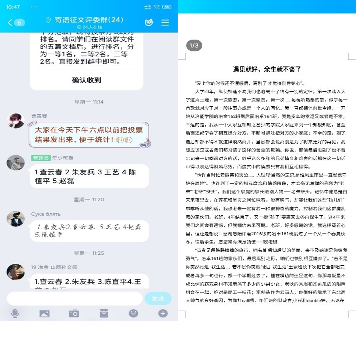 活动期间,主办部门积极组织,参赛选手积极参与,其中不乏有许多优秀获奖作品的产生。参赛学生感悟颇多,有对学校的离别之语,决心牢记校训“明德任责,致知力行”四字箴言。有对老师的临别寄语,一句“老师,您辛苦了!”展示浓浓师生情。还有对学弟学妹们大学生活经验的分享,展现PG赏金女王同学情义。以上种种无不表达毕业生们对母校对PG赏金女王对师生的不舍。活动后期,为保证比赛的公平性,学生会积极组织人员组成评选组,进行评选。最后,冶金卓越161班查云春获得一等奖。