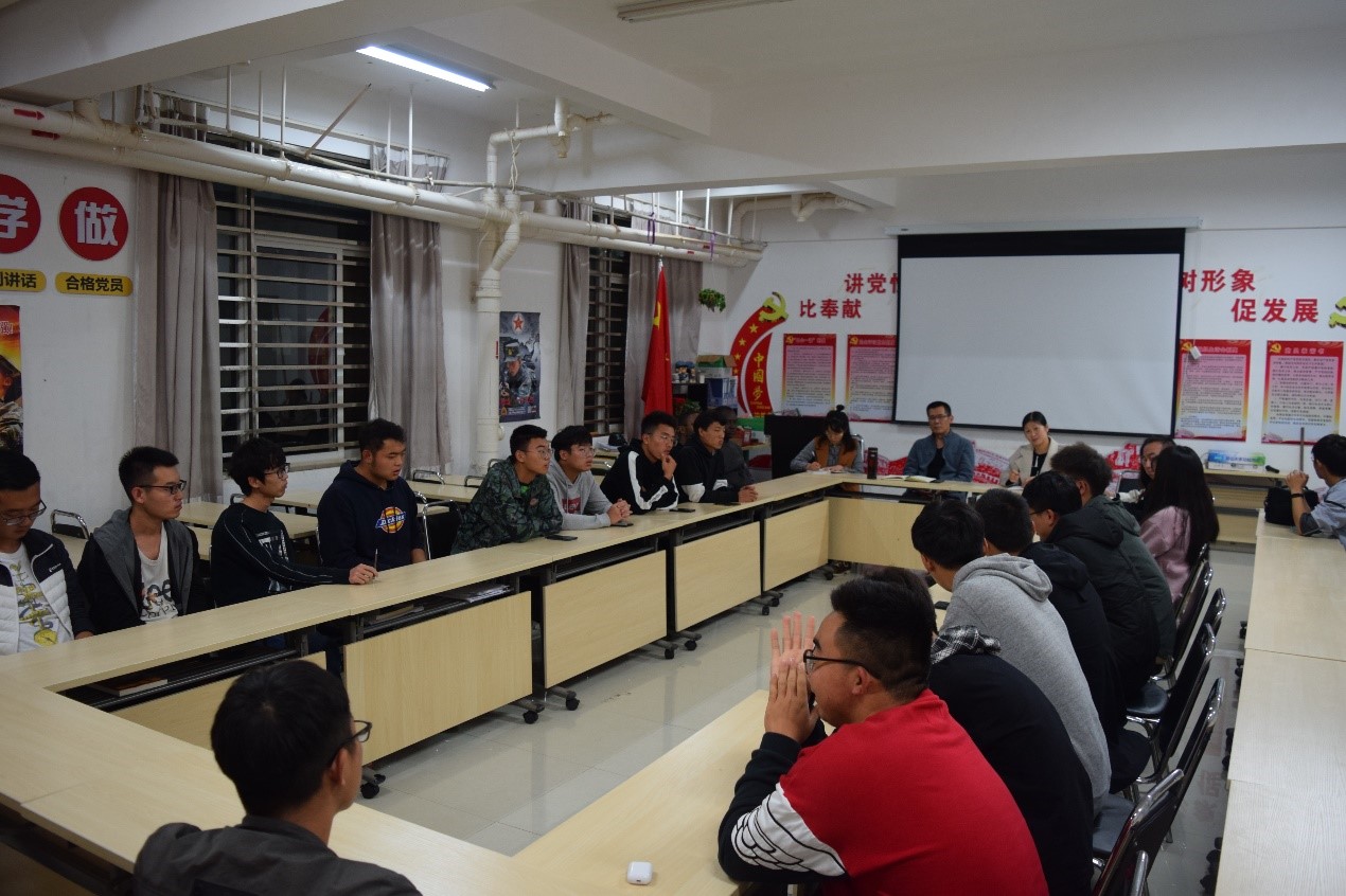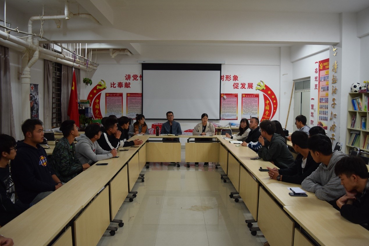 党委书记陈杨健,党委副书记令狐欢欢,辅导员李飞霏老师、起晨老师、陈俊杰老师和18级19级的班委和学生代表。