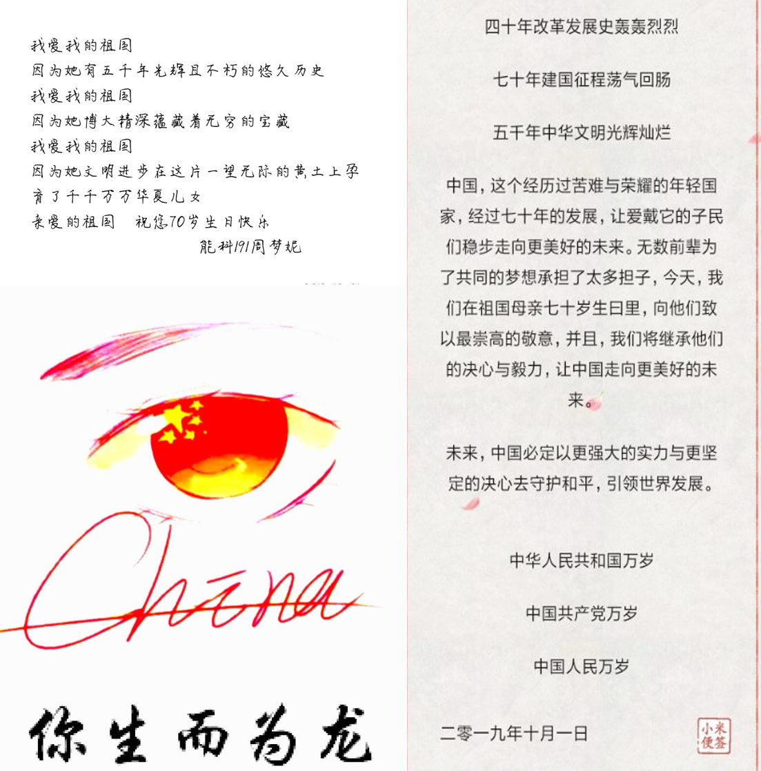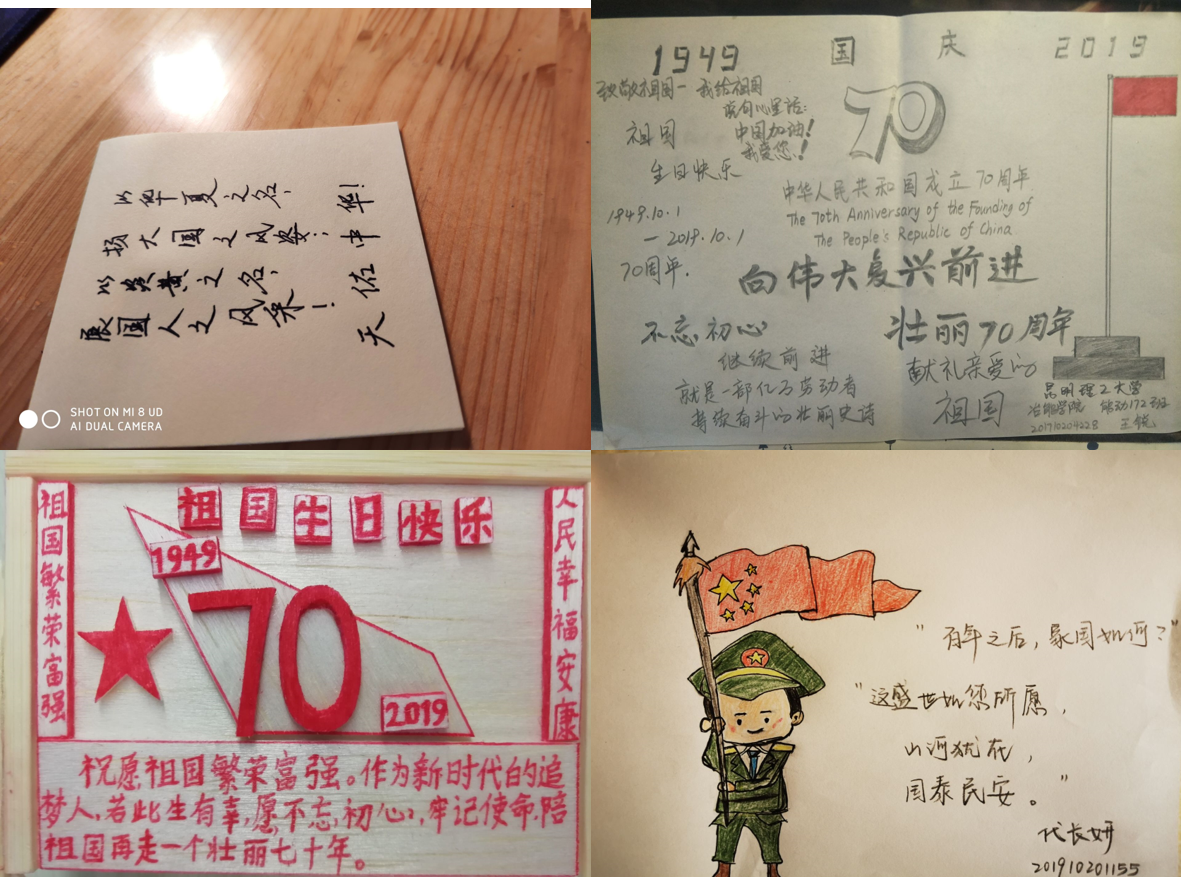 此次活动是为了庆祝祖国母亲70岁华诞,弘扬以爱国主义为核心的民族精神,增强我院同学们的民族自豪感,同时也为广大同学提供了一个寄语祖国的平台,培养了同学们思想热情的积极性。