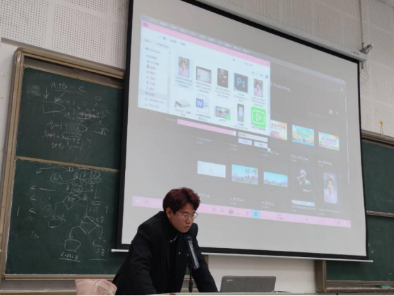 首先,韩靖岐强调了海报制作在活动宣传中的重要作用,随后以人像为例,演示如何使用PS工具对人物图片进行润色修图等后期处理,讲解生动有趣。同学们认真聆听,跟随演示在自己的电脑上进行操作。提问环节中,韩靖岐手把手教带同学,解答疑问,气氛融洽。