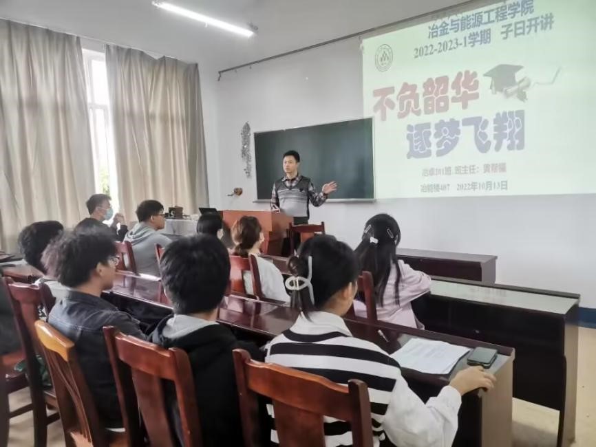 在冶能楼407教室举办“子约开讲”系列活动之“不负韶华,逐梦飞翔”讲座。本期讲座由冶卓201班班主任黄帮福担任主讲嘉宾,70余名本科生参加讲座。