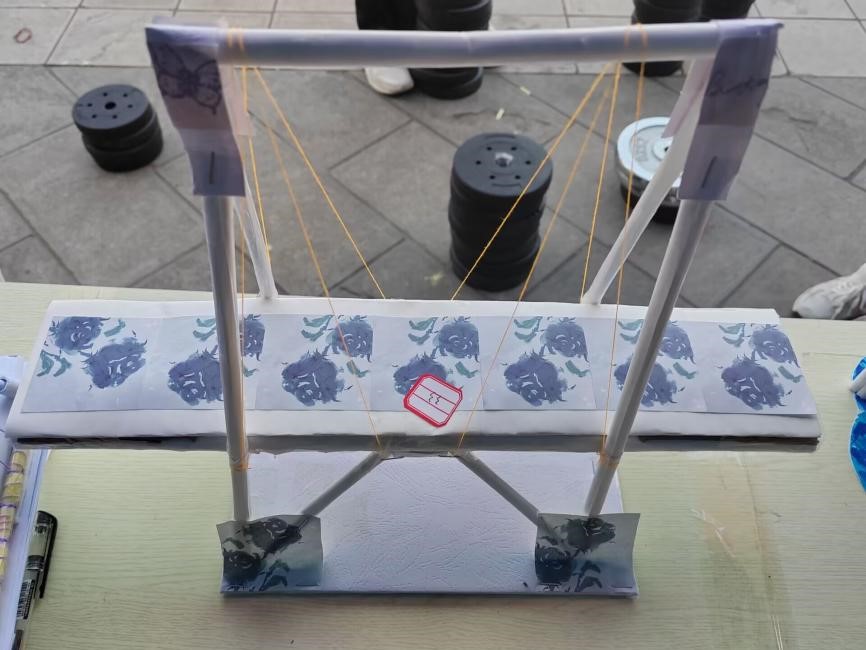 承重组作品结构合理、承载力强。在小心翼翼的加重过程中,每一次的摆放、犹豫与停顿都牵动众人心弦。而纸桥一次次地增加荷载,刷新比赛承重比记录,引发了观众的阵阵喝彩。最终,自重41.6克的纸桥作品承载了156千克的荷载,该作品承重比为2.5325,获得一等奖。