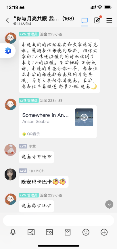 活动期间,同学们每晚在活动QQ群内互道“晚安”,分享轻音乐。每晚22:00工作人员收集来自同学们的“晚安”短信并随机发送给其他同学。在活动开展的7天时间里,共有1000余条晚安短信在每晚同一时刻飞向校园各地,给同学们送去温馨的问候。这些晚安短信或温暖有力,或诙谐活泼,承载着书写者恬淡的温情,抚慰了同学们疲惫的心灵。