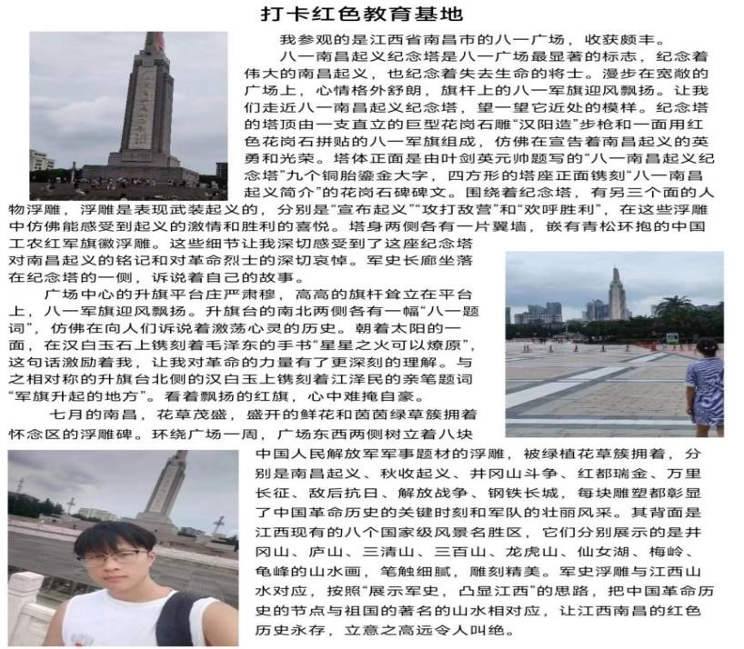 本次活动采取线上形式举办,参与的同学自行前往红色教育基地参观学习调研。同学们有的通过视频、照片讲家乡的红色历史故事;有的采访老兵,回顾峥嵘往事,并分享采访感悟。活动反响热烈,彰显了同学们浓浓的家国情怀,表达了对革命先烈的尊重与敬仰。