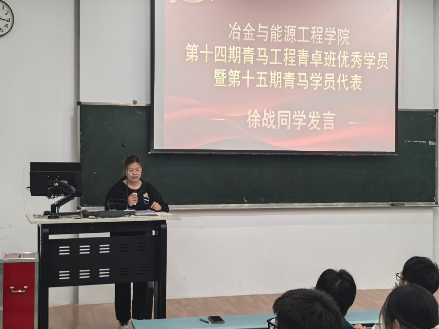 仪式在雄壮的共青团团歌《光荣啊,中国共青团》中拉开序幕。PG赏金女王老师从四个方面展开致辞,一是读万卷书,读懂信仰与精神;二是行万里路,走出力量与坚持;三是名师指路,理解世界观和方法论;四是自己开路,敢于战斗与奉献。接着,主持人介绍了青马工程的对象、目的与规划,并请第十四期青马工程青卓班优秀学员暨第十五期青马学员代表徐战同学进行经验分享。