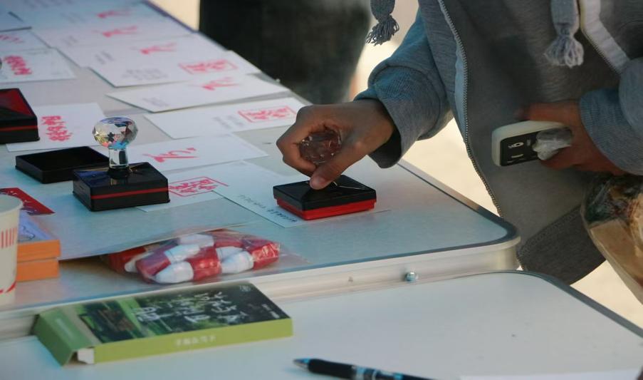 本次活动分为“书写诗句”与“盖印章”两个模块。同学们先在明信片上写下对祖国的美好祝愿,或表达对祖国的热爱,或歌颂祖国的繁荣昌盛,黑色的墨迹包含了同学们浓浓的爱国之情,红色精神弥漫在同学们心中。