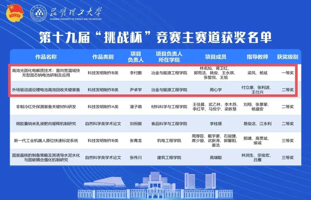 获一等奖1项、二等奖1项。其中,《高效光固化电解质技术:面向宽温域快充型固态钠电池研制及应用》项目荣获科技发明制作B类一等奖;《外场驱动退役锂电池高效回收关键设备》项目荣获科技发明制作B类二等奖。
