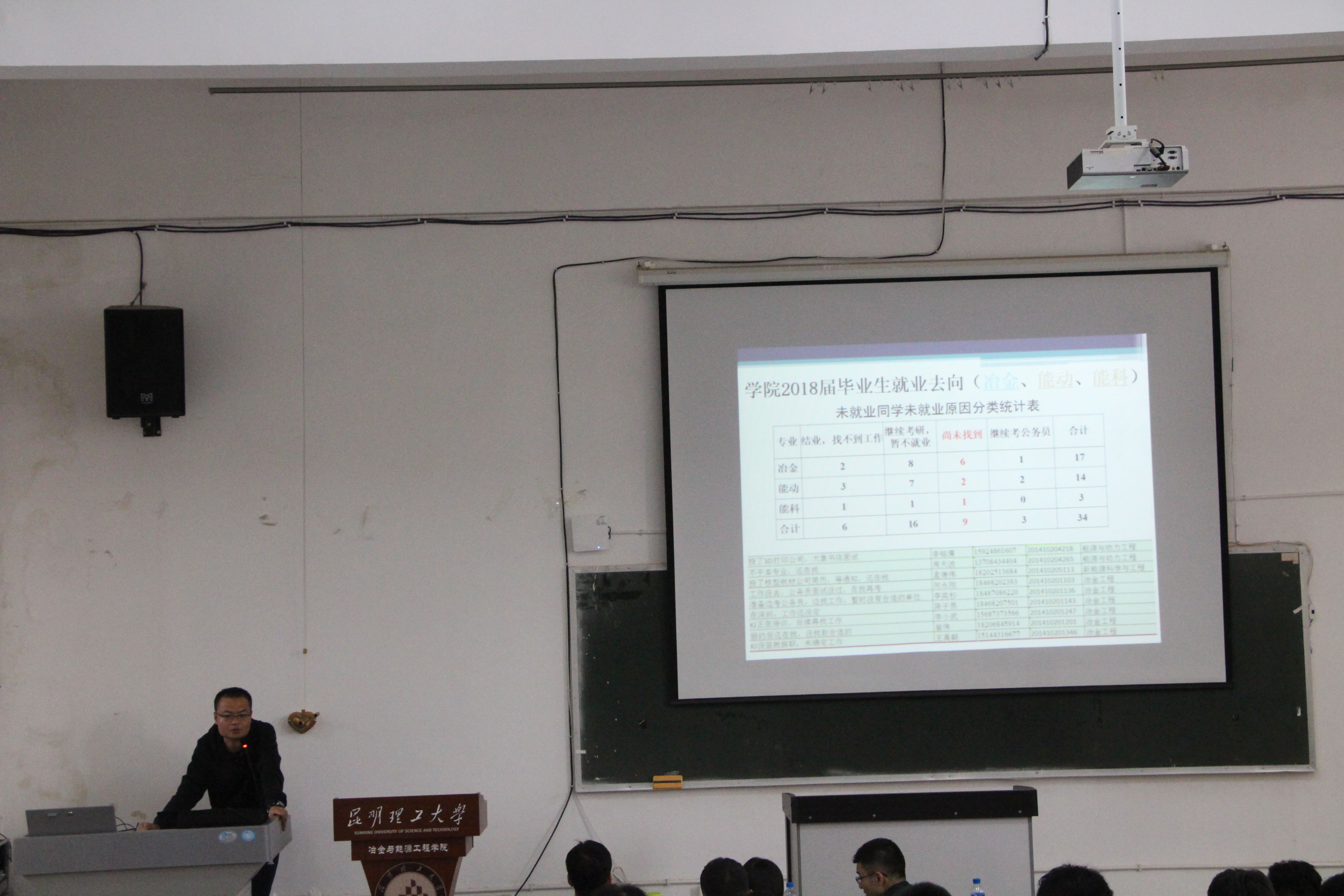 随后,能动系副主任刘慧利老师、吕顺利老师结合各自专业做动员,为同学们全面的剖析了毕业后的就业方向,鼓励大家在最后一年要认真准备,积极备战,多多关注各个渠道的就业信息,告诫大家不要好高骛远,要努力提升自己的个人素质来适应时代和社会的发展要求。之后,由冶金系副主任黄帮福老师针对同学们毕业后要面临的问题做出了全面的分析,希望同学在工作岗位上要不耻下问,刻苦钻研,不断地提高自己的能力。在大四的学习中不断磨炼自己,为就业打下坚实的基础。