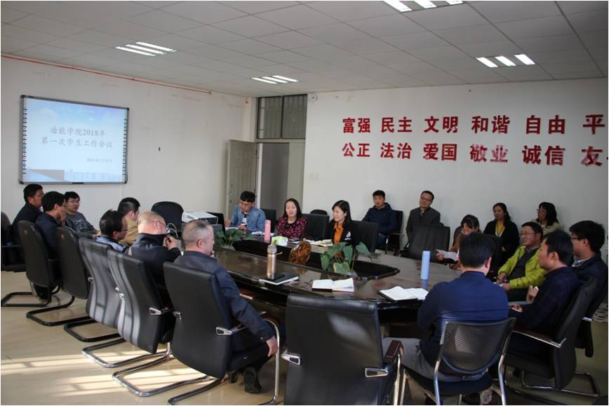 在冶能楼202会议室召开2018年新学期第一次学生工作会议, PG赏金女王党委书记陈杨健、党委副书记令狐欢欢、学工办主任于志强及全体辅导员、班主任参加了会议。会议由令狐副书记主持。