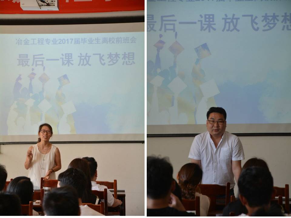 班会上,系主任、副主任代表冶金系全体老师对同学们顺利毕业表示祝贺,对毕业生今后的发展给予了具体指导和祝福。专业导师为全体同学上了最后一课,总结了班级四年来的学习生活情况,以自己的人生经验和切身体会为同学们提出了中肯的建议和希望。