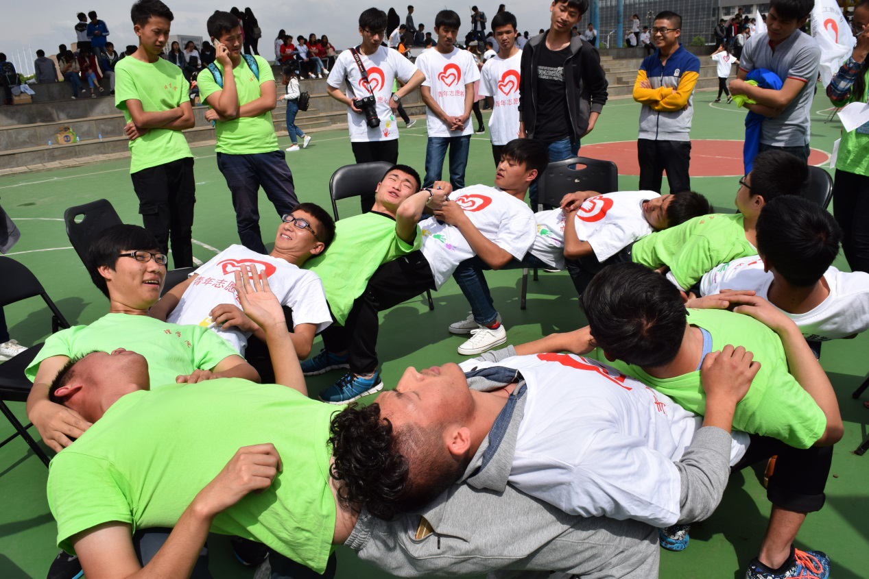 比赛开始,参赛志愿者们都激情满满,此次赛制为循环赛,一个项目完成后下一个项目才能开始,否则视为犯规。下面我们就一起看一下其中几个游戏项目吧,仙人指路:由一人指挥,另一人蒙眼在指挥者的口令下越过对手设置的八个人墙障碍,设置障碍的同学们摆出各种姿势去阻拦蒙眼人,指挥者用尽浑身解数让蒙眼人通过,现场气氛紧张而激烈。水的呼唤:这是最考验团队协作和肢体协调的项目,大家在圆圈外拉住一名队员,用各种方法去够得圆圈中的水瓶,尝试过各种方法的队员们,终于找到了最合适的人选和方法完成了游戏,虽然完成很困难,但是到最后大家都非常开心。其他各项游戏也都有序地进行着,比赛过程中不乏各种有趣的小插曲发生,大家都用尽全力争取获得最佳成绩。待所有队伍完成前6项游戏项目后,即抽签进行多角拔河,各队队员们都齐心协力向着最佳成绩的共同目标前进。12点,所有比赛结束,主持人宣布获奖名单,并由嘉宾为优胜者颁奖。最后,所有队伍合影留念,并在横幅上签名。活动结束后,看到志愿者们脸上都洋溢着满满的笑容,作为工作人员的我们也都心花怒放。