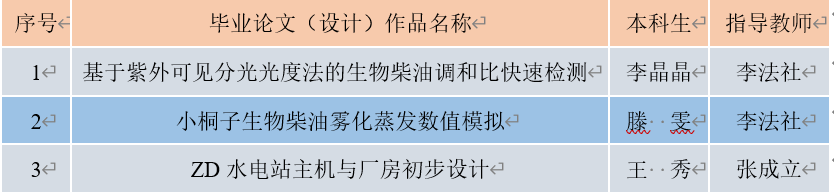 能源与动力工程专业3件毕业论文(设计)入选全国毕业论文(设计)优秀作品,分别为李法社教授指导的本科生李晶晶毕业论文《基于紫外可见分光光度法的生物柴油调和比快速检测》、滕雯毕业论文《小桐子生物柴油雾化蒸发数值模拟》和张成立副教授指导本科生王秀的毕业设计《ZD水电站主机与厂房初步设计》。