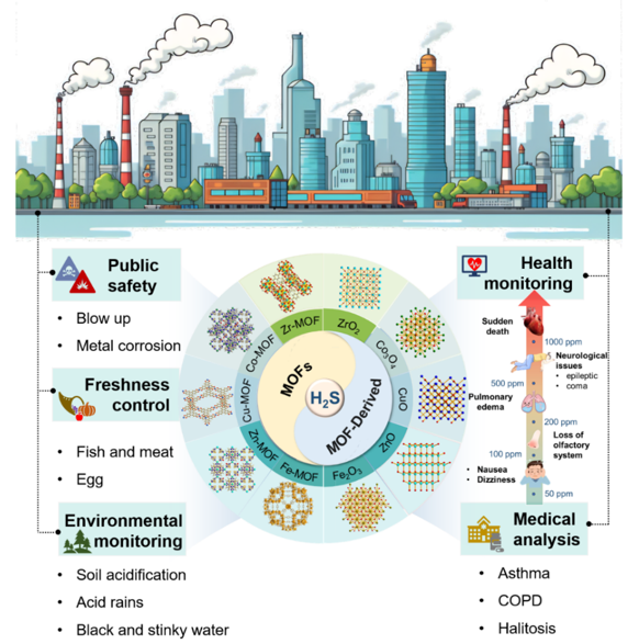 非常规冶金团队在配位化学领域顶级期刊《Coordination Chemistry Reviews》上发表了题为“Advances in metal-organic framework-based hydrogen sulfide gas sensors”的最新综述,系统回顾总结了MOF基复合材料在硫化氢(H2S)气体检测领域的研究进展。在冶金工业生产过程中,尤其是硫化矿焙烧、焦炉煤气净化、有色金属冶炼等环节,常伴有H2S气体的产生。H2S是一种无色、剧毒、易燃的酸性气体,不仅直接危害作业人员健康,还会加剧设备腐蚀、引发催化剂中毒,对金属产品质量与生产安全等过程造成威胁。此外,由于H2S气体在上述工艺过程中无法被肉眼直接观测,其泄漏风险更为隐蔽。因此,开发具有高灵敏、高选择及快响应的H2S气体检测技术具有重要的现实意义。在众多气体传感材料中,金属有机框架(Metal-Organic Frameworks, MOFs)因其高孔隙率、结构多样性和可调控的化学功能,在吸附与检测领域展现出独特优势。该综述从MOFs的基本结构特性、合成方法出发,深入探讨MOFs及其衍生物在H2S气体检测中的应用潜力与机制,指出当前MOF基H2S气体传感器面临的主要挑战,并从材料创新与实际应用推广的角度展望了该领域的未来研究方向。